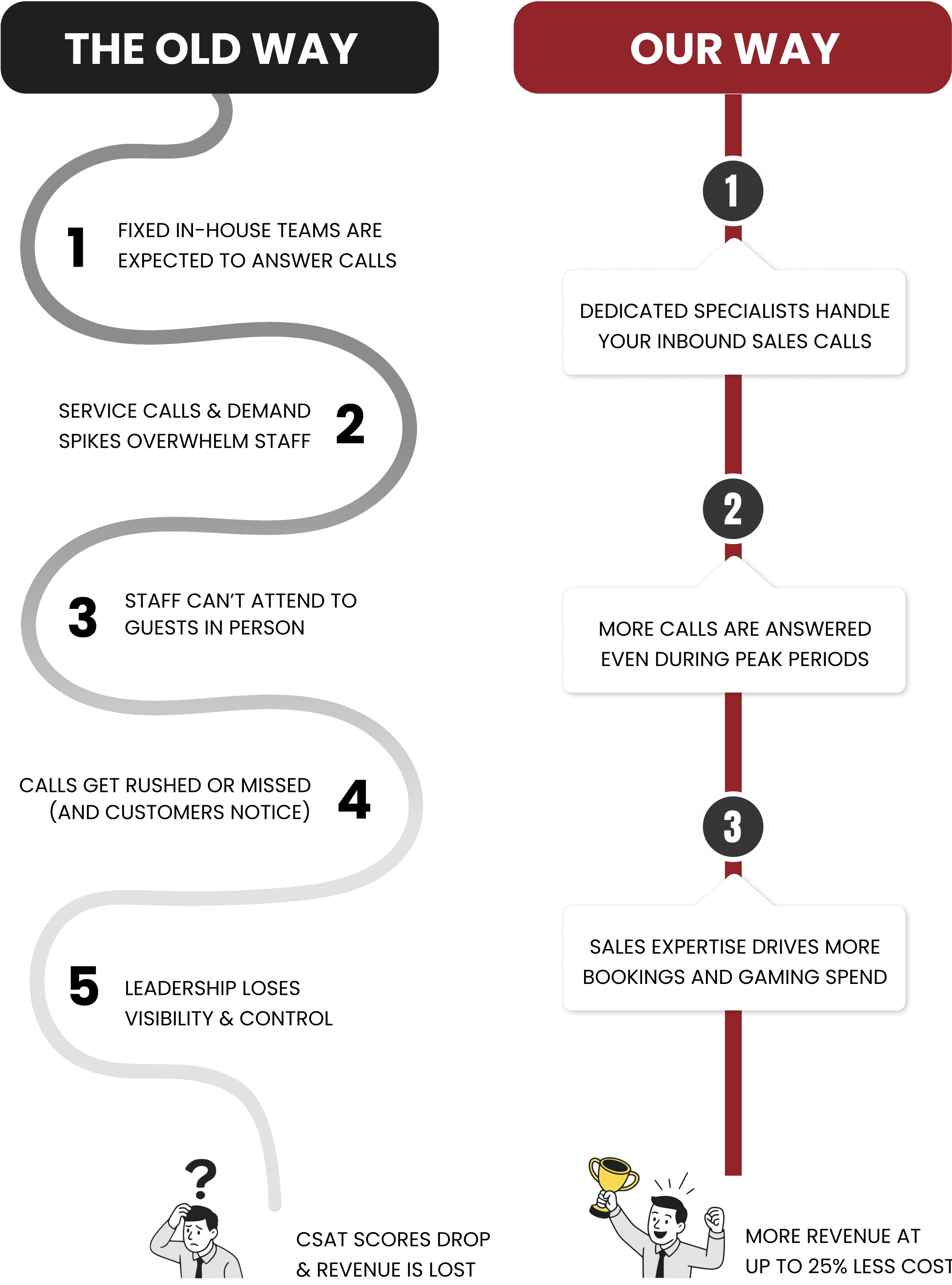 You spend a lot to get the phone to ring - make sure you have the right team answering it. Our trained agents convert inbound calls into booked rooms, higher gaming spend, and long-term players.